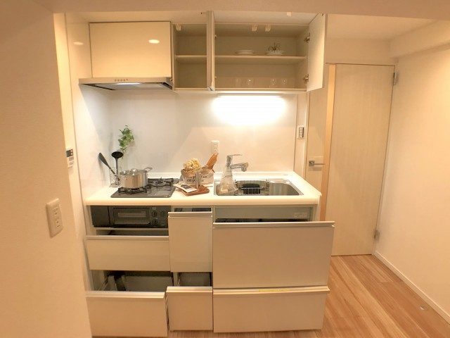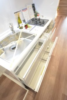 足もとの収納は引き出しタイプ。奥まで無駄なく収納に使うことが出来るので、散らかりがちのキッチンもスッキリしそうですねヽ(・∀・ )ノ
