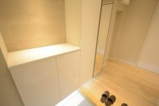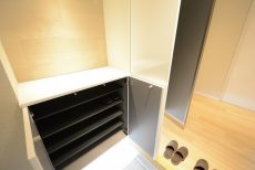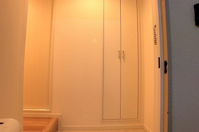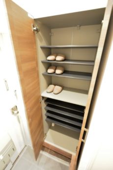 シューズボックスはトールタイプ。玄関内に出っ張る事もなくすっきりと設置されています。収納力抜群、棚板の高さを調整すればブーツなどの背の高い靴でも立てて収納可能ですよ。