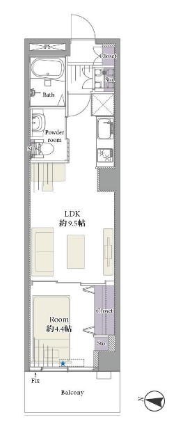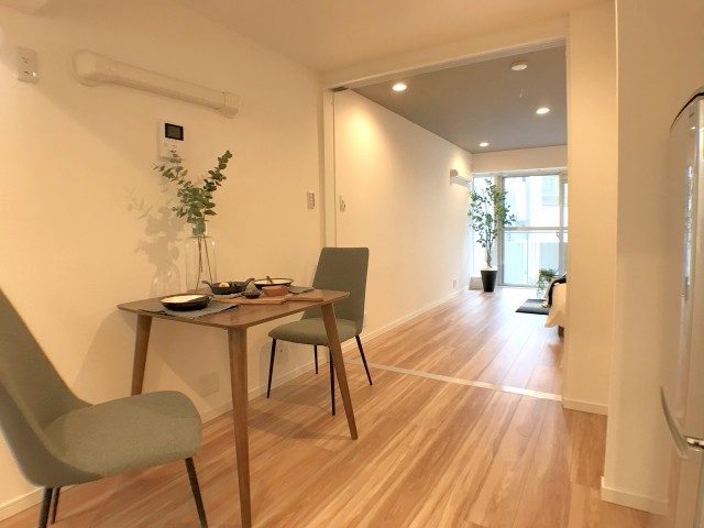 こちらが約9.5帖のリビング・ダイニング・キッチン+約4.4帖の洋室。洋室の仕切り戸を開けてリビングの一部とした様子です。普段はこんな感じでワンルームのような使い方をしたり、お客さんに見せたくない物を奥の洋室に隠したり・・・ライフスタイルや状況によって様々な使い方が出来るのはいいですね。
