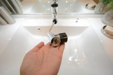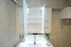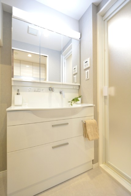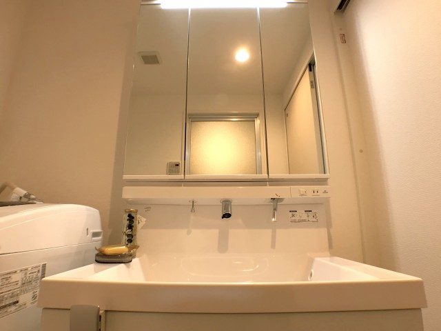 白一色で清潔感のある洗面台は三面鏡付き。上部の照明によって、鏡を使う時に影になったりもしません。