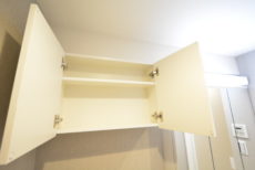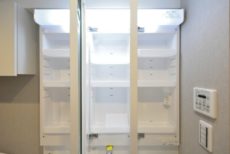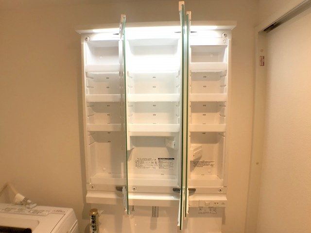 三面鏡の中は収納スペースになっています。細かく仕切られているので、散らかりがちな洗面周りもスッキリまとめられることが出来そうです。