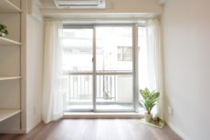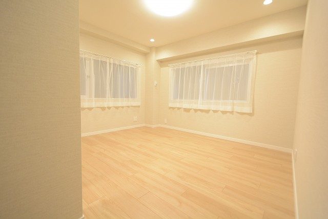 本来の約4.4帖の洋室に戻ります。引き戸はドアと違ってデッドスペースを作りませんので、4.4帖まるまる使う事が出来ますよ。西向きのバルコニーに面した窓があり、とても明るいお部屋です。