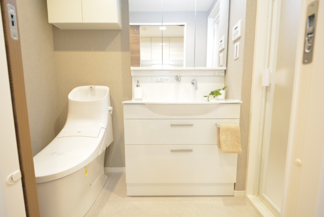 洗面室にはトイレ、洗面台、浴室がまとまっていて、脱衣所も兼ねています。