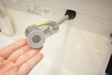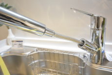 水栓は浄水機能付きシャワー水栓。切替えひとつで気軽に美味しいお水が使えます。ヘッドが伸びるので、シンクのお掃除にも便利ですよ。