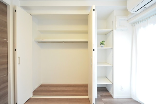 収納はオープンの収納棚とクローゼット。クローゼットは間口が広くて使いやすそうですね。パッとひと目で確認出来て、服を選ぶ時もイメージしやすいですよ。忙しい朝も大助かり(^^♪