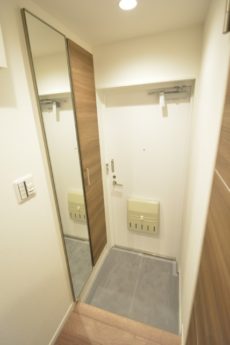 シューズボックスの扉に付いた姿見が、お出かけ前には活躍してくれそうですね。帰って来た時は人感センサーが自動的にライトを点けてくれるので、暗い中手探りでスイッチを探す必要はありません。荷物がいっぱいで両手が塞がっている時などにも助かります。