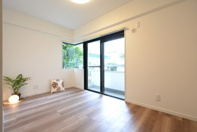 こちらは約4.9帖の洋室。南東向きバルコニーに面した大きな窓の他に、コーナーにはFIX窓が設置されていてとても明るいお部屋になっています。