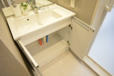 収納は洗面台下とサイドに設置されたキャビネット。大きな物から細かい物までバランスよく収まりそうです。