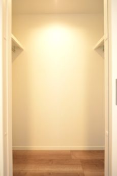 収納はウォークインクローゼット!!両側にハンガーポールが設置された大きな収納です。キャリーバッグやスーツケースなどの大きな物も入りますし、衣装ケースなどを置けば収納力のアップも出来ますよ。