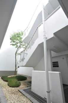 エレベーターを2階で降りて、中庭を取り囲む廊下を進むとお部屋へ到着です。開放的でありながら外の目を気にしなくていい、いいとこ取りの廊下ですね。
