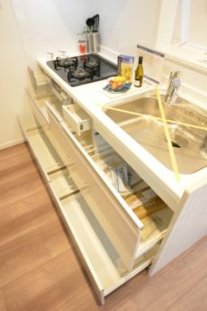 調理台下はスライドキャビネット。引き出しタイプは出し入れがしやすく、ぎっしり詰めても中が確認しやすいのがいいところですね。