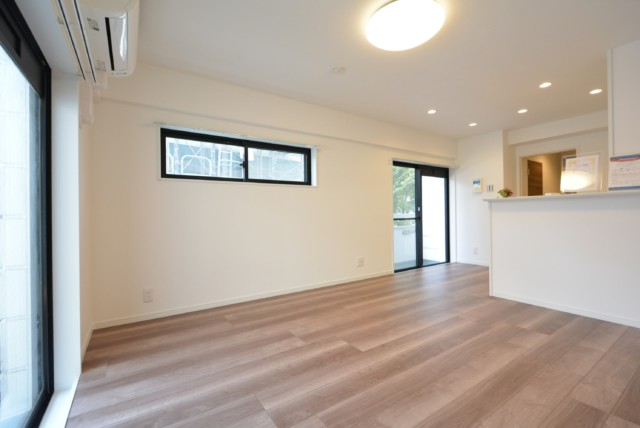 北西・北東の二面採光。バルコニーに面した大きな窓で採光、通風共に良好です。ナチュラルな雰囲気の中、サッシの枠の濃い色がいいアクセントになっていますね。キッチンは人気のカウンタータイプ。コミュニケーションが取りやすく、調理中でも会話の途切れないキッチンです。