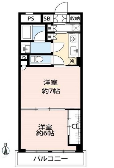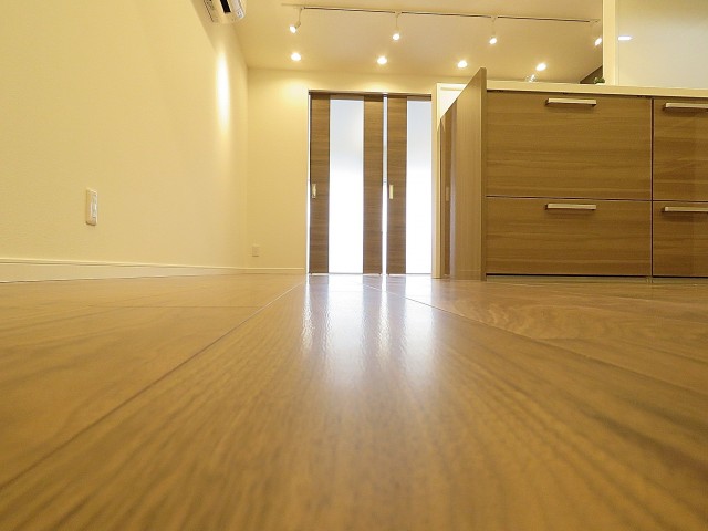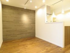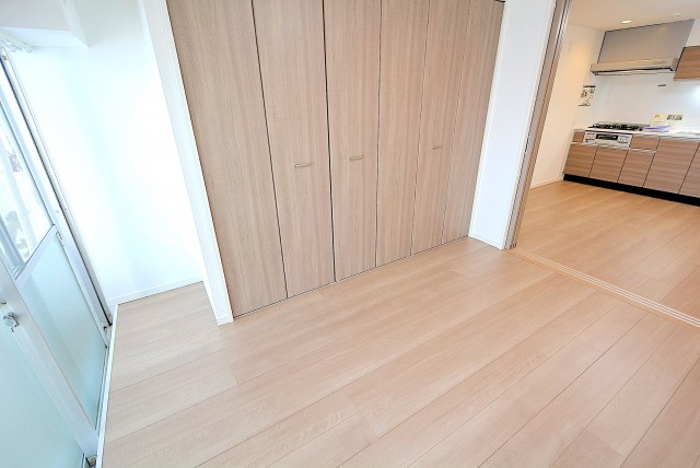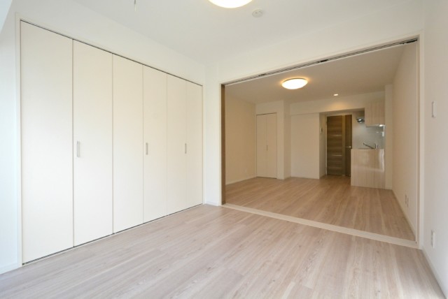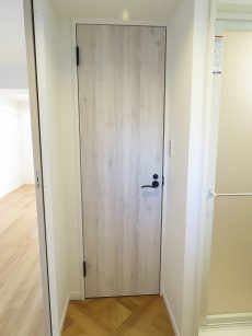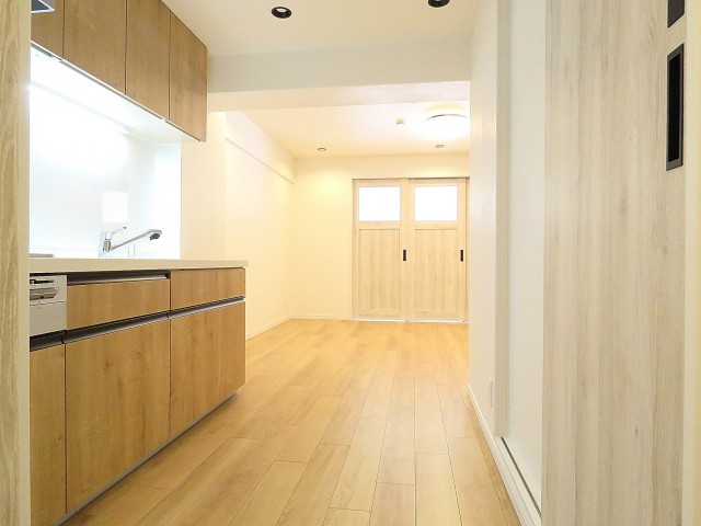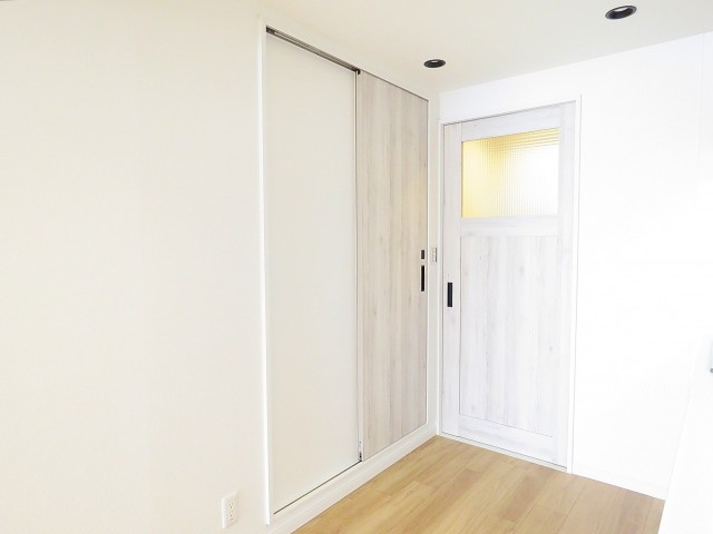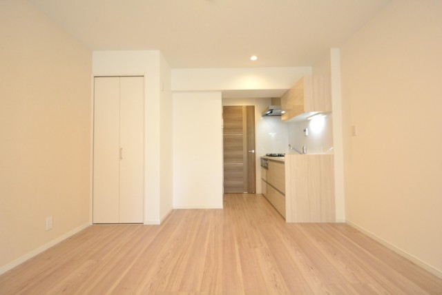 キッチンのお隣は約7帖の洋室です。シンプルな形で使い勝手がよさそうなお部屋です。窓はついていませんが、奥の洋室ドアから光が入ります。