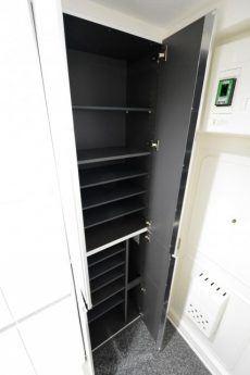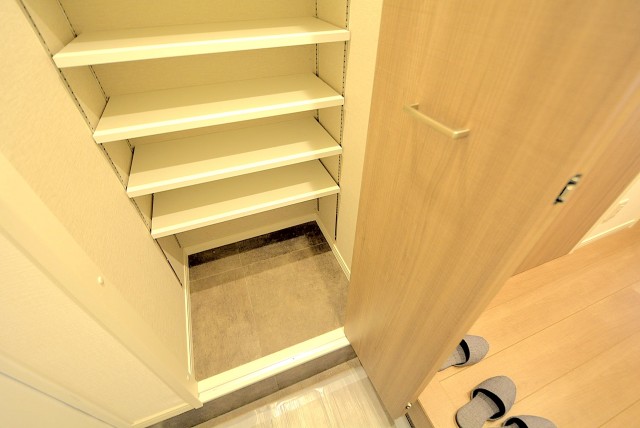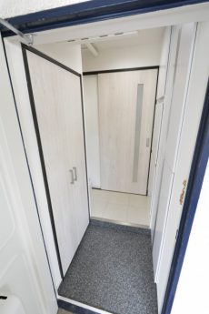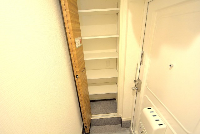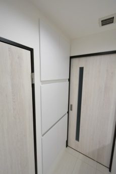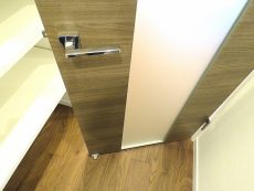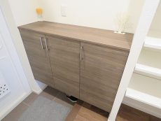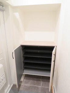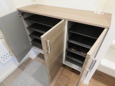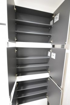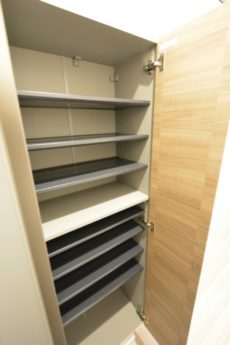 シューズボックスはトールタイプ。棚の高さが変えられるので、ブーツなどでも収納可能ですよ。ドアには安心のダブルロックが設置されています。