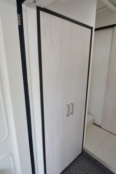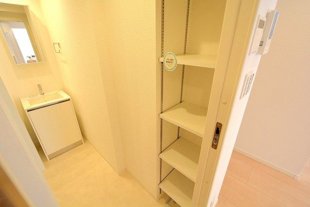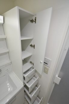 洗面台の横には、しっかりと大きな収納が♪♪スライド式のドアもあって、いろいろな物が収納できそうです。