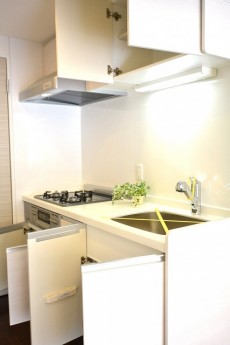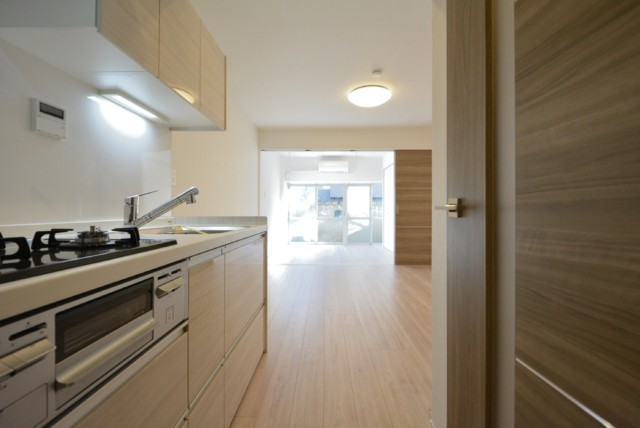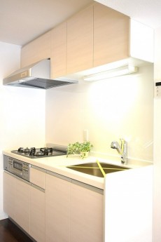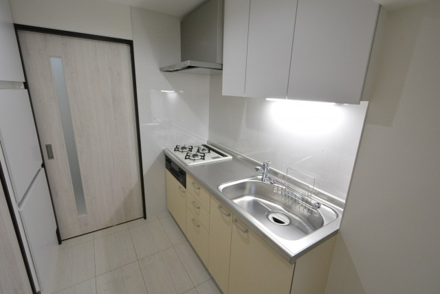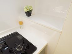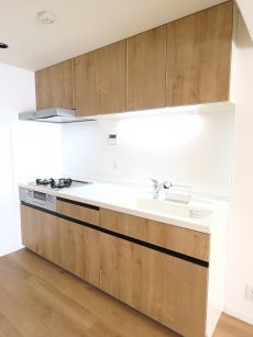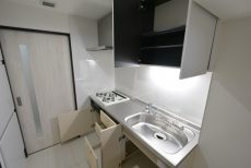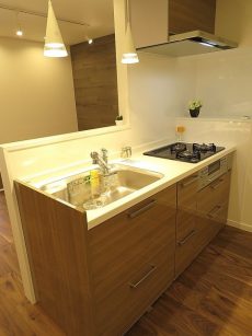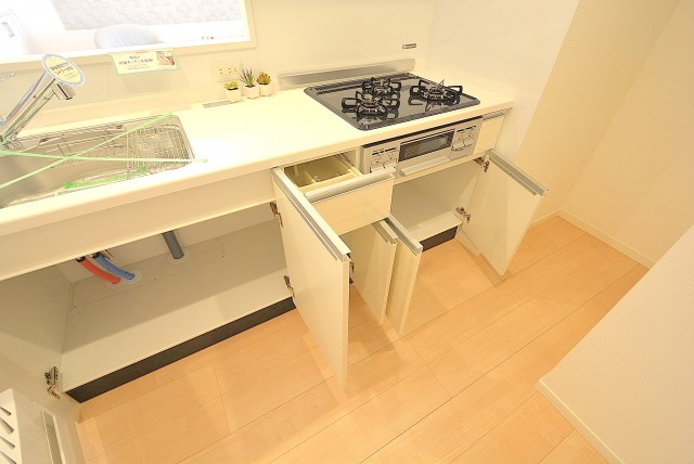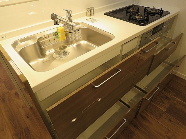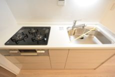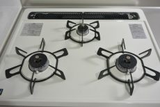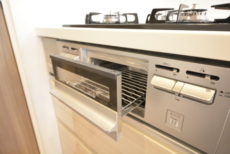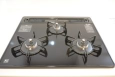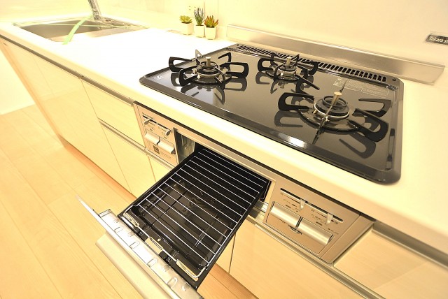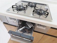 三口コンロに片面焼きグリルと調理器具も充実しています。