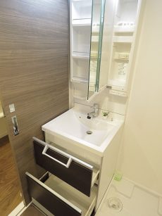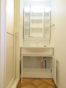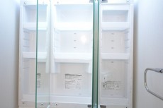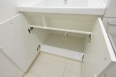 収納は三面鏡裏のキャビネットと洗面台下。細かい物から大きな物までいい感じに納まりそうですね。