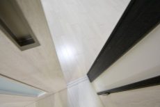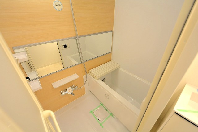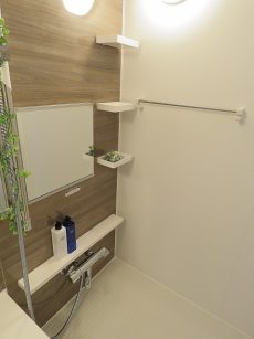 バスルームはナチュラルな色合いの木目柄パネルが使われており、やわらかい雰囲気。
