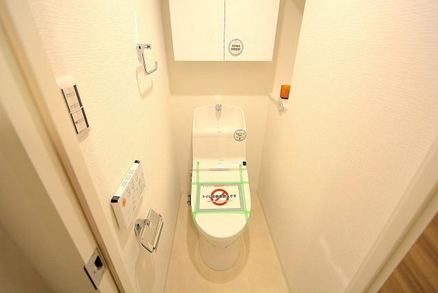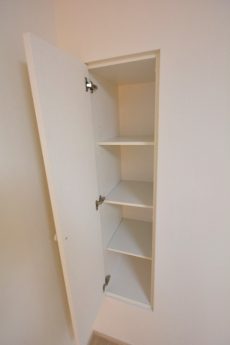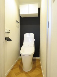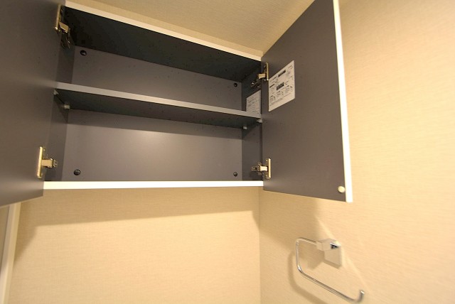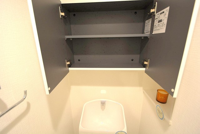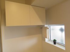 吊戸棚もあるのでトイレットぺ―パーなどの消耗品はこちらに収納できますね!扉が付いているので人目にもつかないですよ( ・`ω・´)
