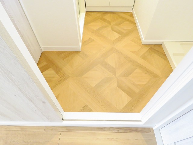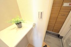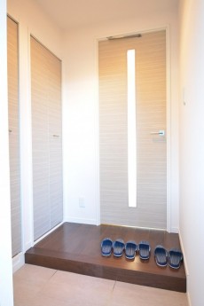 玄関ホール。人感センサーがついており、人の動きを察知して自動で照明が消灯・点灯します。消し忘れがなく経済的な上、スイッチを押す手間も省けます。インターホンは来訪者の顔が確認できるTVモニター付き。防犯面も安心です。