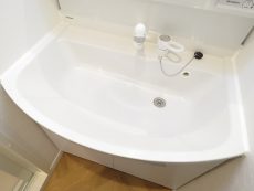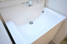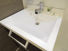 洗面台は、ホワイトを基調として清潔感バツグン。洗面台は、ミラー横にポケットが6つ、カウンター下にも収納があるので、歯ブラシ、化粧品などの小物からお掃除用具、洗剤といった物までしっかりしまえます。
