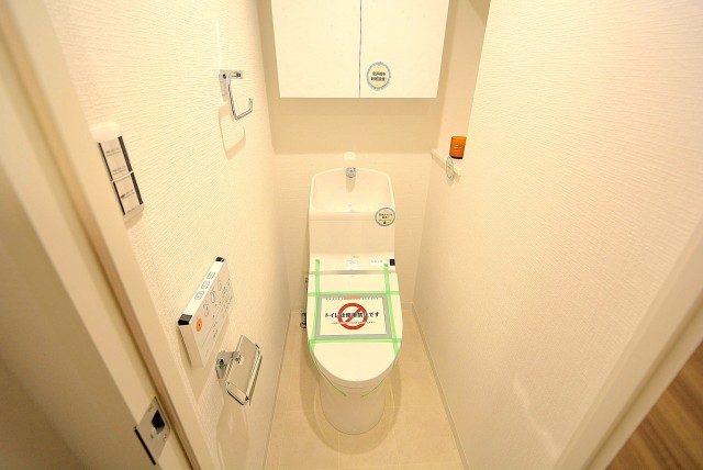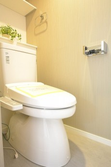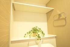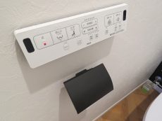トイレはウォシュレット付き。後ろに物が置ける棚も設置されています。