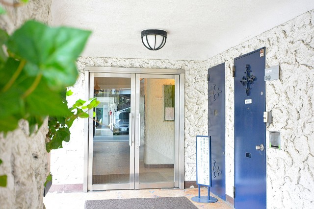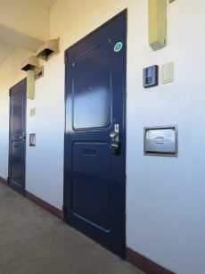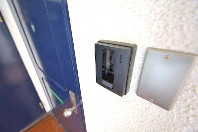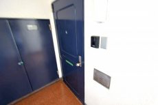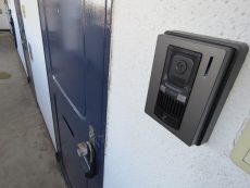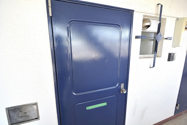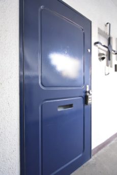 このマンションのカラーであるブルーの玄関ドアに到着です!ドア横にはテレビモニター付きインターホンが設置されていて、お部屋の中から訪問者を確認する事が出来ます。返事をする前にしっかりチェックしましょうね。