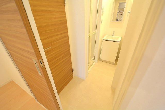 洗面室は、右手にバスルーム。正面に洗面台の配置になっています。