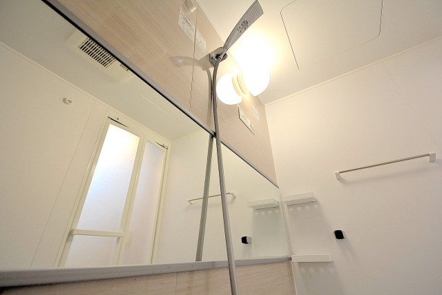 洗面化粧台は鏡の裏が一面収納、水栓はシャワー水栓と機能的。
