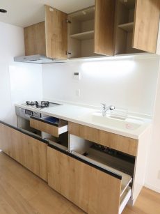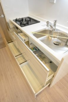 収納は吊戸棚と調理台下。引き出しタイプは奥まで出し入れがし易くて助かります。