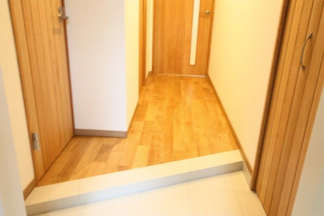 床はピカピカで、ライトやドアなどが写り込んでいました。つるつるだとお掃除がしやすそうですね。右側にドアが三つと、正面にはスリットガラス入りのドアが見えます。
