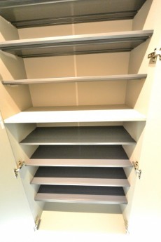 シューズボックスの隣には廊下収納があります。奥行きがあり、可動式の棚板が付いているので、前後・上下と幅広くお使いいただけて、たっぷり収納できそうです(^^)/