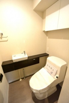 トイレには小さな洗面台とカウンター、上部には吊り棚があって、綺麗にスッキリとお使い頂けそうです☆