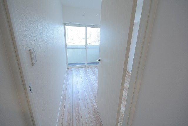左右に洗濯機置場とトイレ、正面にLDKの扉が設置されています。