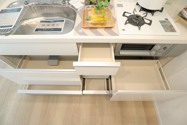 収納は調理台下のスライドキャビネットと吊戸棚。スライドキャビネットは引き出し式で出し入れがしやすく、大きな鍋なども楽に収納出来ます。ギッチリ詰めても収納物の確認がしやすいのも嬉しいですね。