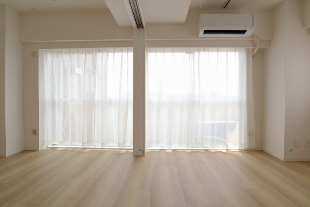 2面に窓のある明るいLDK。長方形の空間は家具の配置もしやすく使い勝手がよさそうです。エアコンが設置されているので引っ越したその日から快適にくつろげますね。
