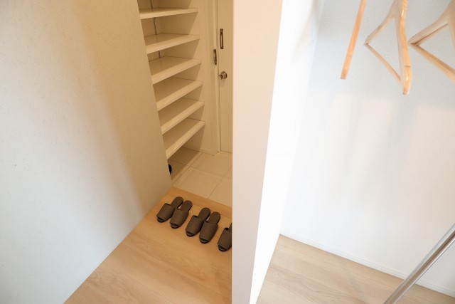 扉を開けると右側にシューズBOX、正面に横に廊下が伸びています。