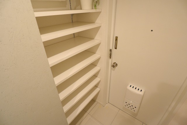 シューズボックスはトールタイプが二つ。ホールに並んでいます。これだけあれば靴好きの方も満足ですね♪ 可動式の棚を調節すればブーツなどでも収納可能です。
