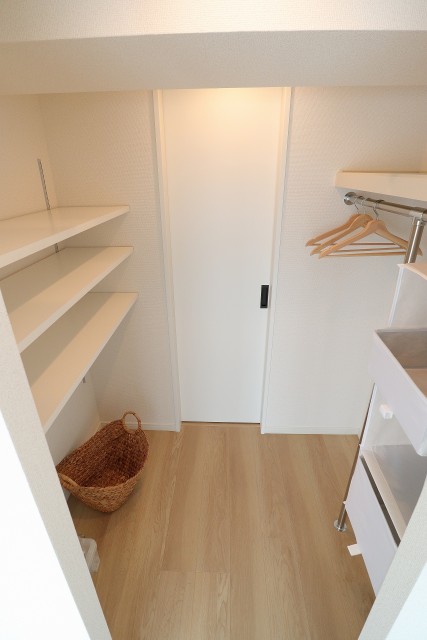洗濯機置場隣には収納棚があるのでリネン類などこちらへしまえますよ(*´▽`)