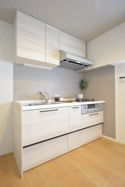 キッチンは壁付けタイプ。省スペースでお部屋を広く使えます。ただ、どうしてもキッチン内が目立つので普段からなるべくキレイにしておきたいものです^^;)
