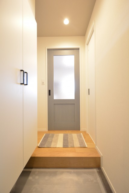玄関ホールは、濃いめのフローリングや建具を使った落ち着いた雰囲気。リノベーション完成直後ということでとても綺麗ですよ。