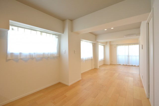 こちらは約11.3帖のリビング・ダイニング・キッチン。南東向きのバルコニーに面した明るいお部屋です。今テーブルが置いてある辺りがリビング、手前キッチン前にダイニングと家具のレイアウトのしやすそうなお部屋ですね。(テーブルは打ち合わせ用で見本家具ではありません)