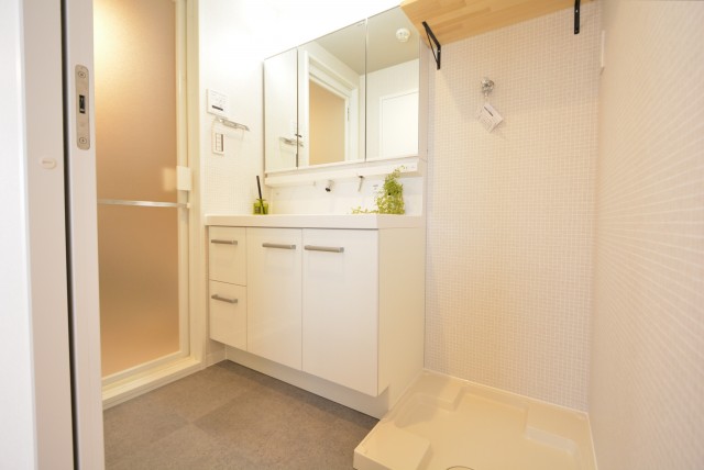 洗面室には洗面台の他に、洗濯機スペース、浴室、リネン棚がまとまっていて、脱衣所も兼ねています。洗濯機スペースには吊戸棚も付いているので、洗剤などの洗濯グッズをまとめておくことが出来ますよ。