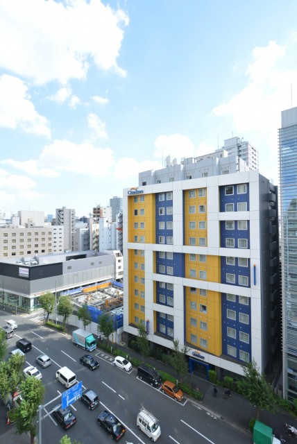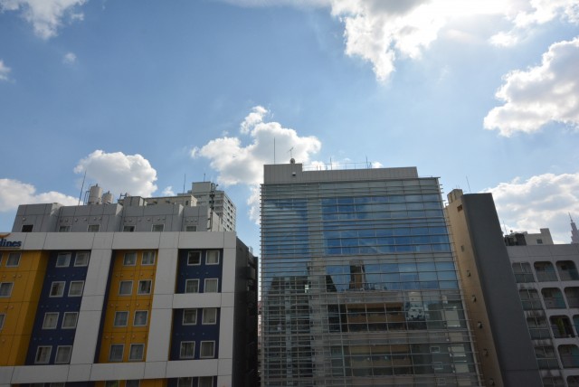 靖国通りに出ると、道路の向かい側にマンションが見えます(写真中央の建物です)