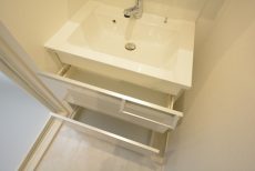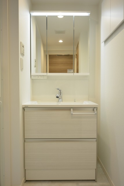 ます(洗面室の床も同じタイルです)。上部に吊戸棚がありますので、生活感が