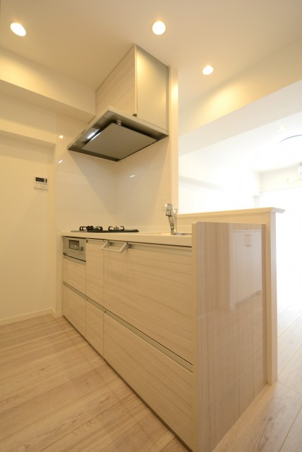 機能的なシステムキッチン。天板の人造大理石のホワイトが美しいです。