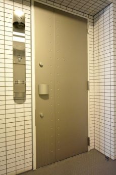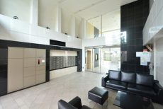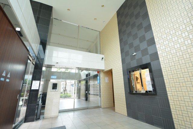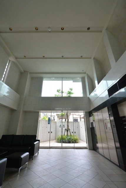 天井が高くてガラスを多く使った、明るく開放感のあるホールですね。中に入るには管理人室の前を通る必要があります。