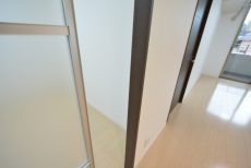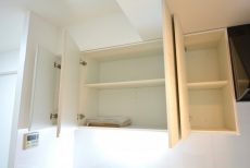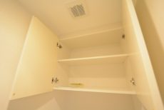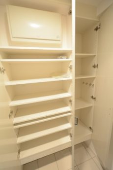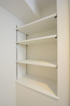洗濯機スペースの横には収納棚があります。リネンなどを置いたり、洗濯関係の物を置いてもいいですね。