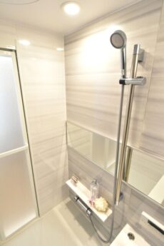 白とグレーで統一されたスッキリとした印象の浴室です。
