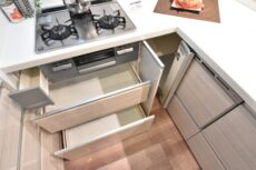 キッチンのワークトップ下はご覧のように引出し収納がかなりの充実度です。